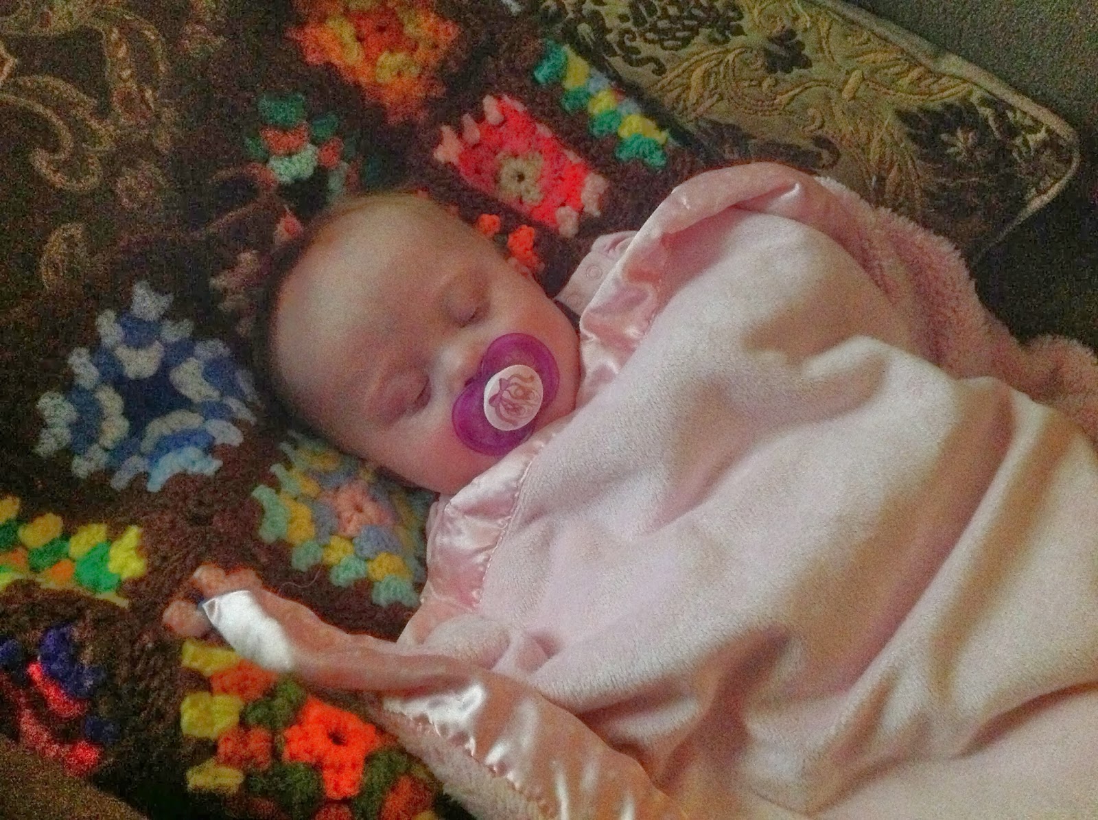 On the flip side of this lucky coin, it seems as if we've traded appetite for the ability to sleep soundly -- the very day her appetite began to perk up, Daddy and I woke in alternating shifts to soothe the fitful whimpering and tossing going on in the bassinet next to us. (And before you raise your eyebrow at us for keeping our eleven month old in our room instead of hers, kindly recall that she sleeps hooked up to a machine that sometimes makes her sick with the force of Old Faithful. We will NOT sleep more than an arm's length from her until this subsides.)
